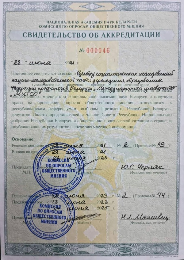 Центр социологических исследований аккредитован Комиссией по опросам общественного мнения при Национальной академии наук Беларуси, свидетельство об аккредитации № 000046 от 28.06.2021).