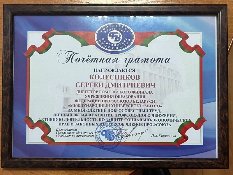 Директору Гомельского филиала Международного университета «МИТСО» Колесникову Сергею Дмитриевичу в честь 50-летия района была вручена Почетная грамота за многолетний добросовестный труд, личный вклад в развитие профсоюзного движения, активную деятельность по защите социально-экономических прав и законных интересов членов профсоюза!