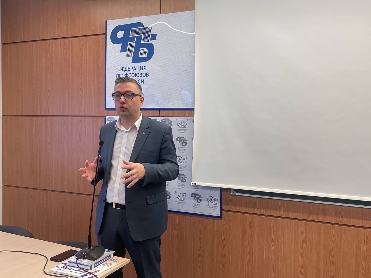 Приглашенным спикером выступил заместитель Председателя Федерации профсоюзов Беларуси Грачев Вадим Николаевич.