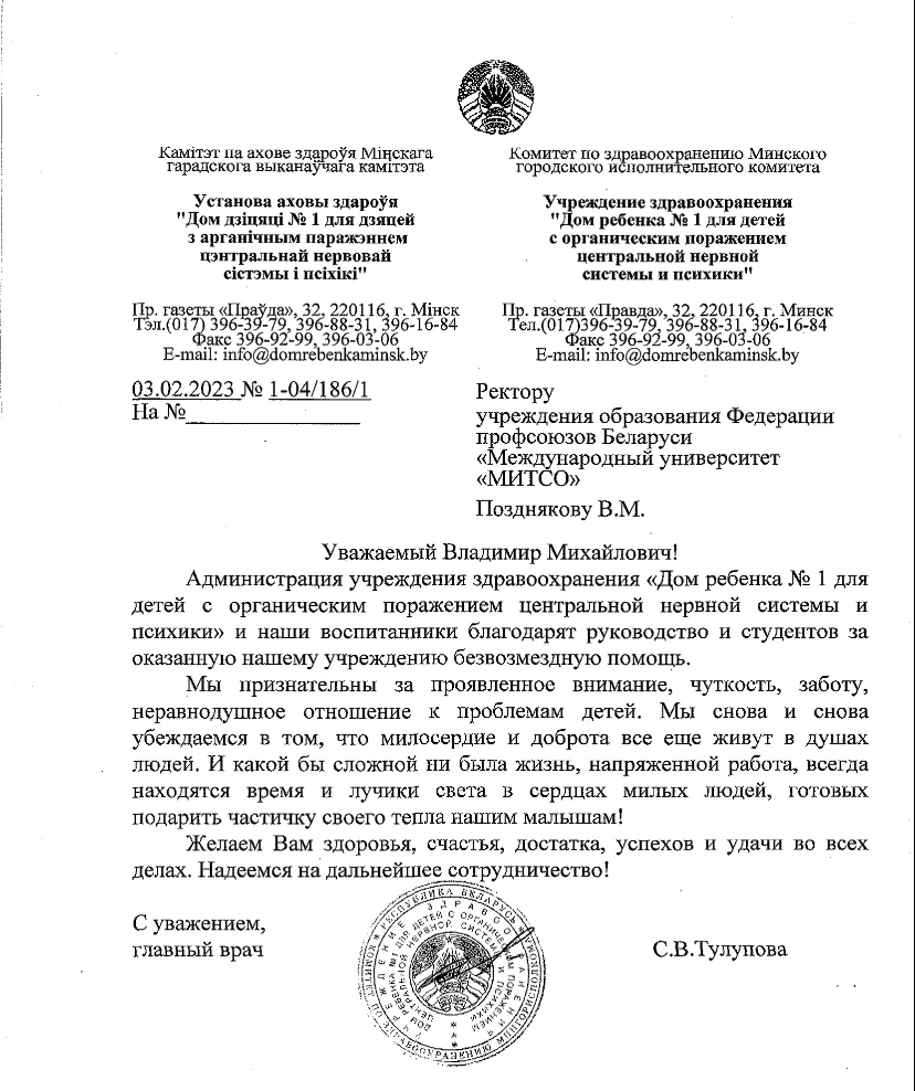 Администрация учреждения здравоохранения "Дом ребенка №1 для детей с ограниченными поражениями центральной нервной системы и психики" выражает благодарность нашему университету.