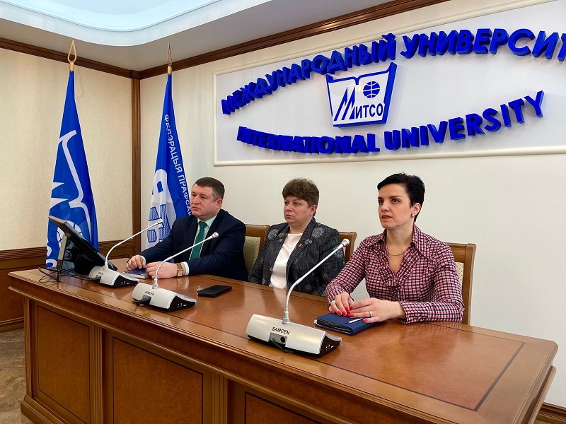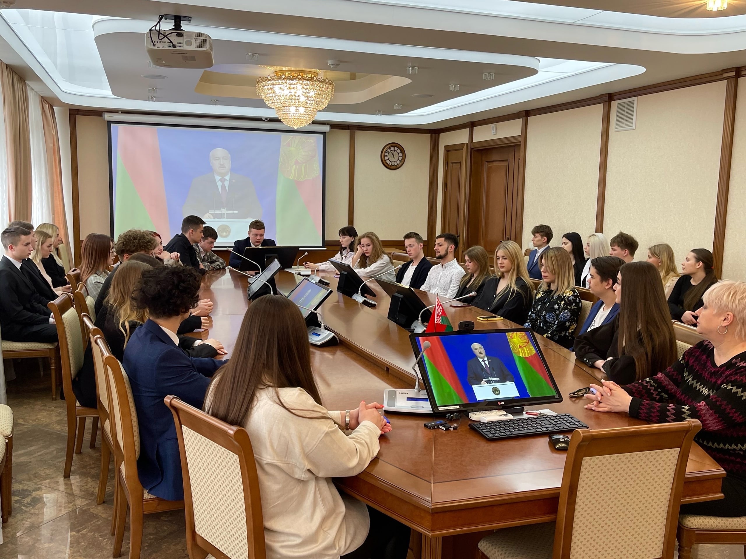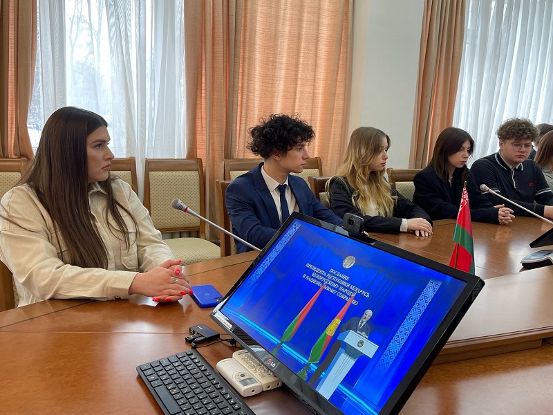 Студенты, преподаватели и сотрудники Международного университета «МИТСО», во главе с проректором по воспитательной работе Еленой Вацлавовной Карпинской-Сакович, внимательно слушают послание Президента Республики Беларусь белорусскому народу и Национальному собранию.