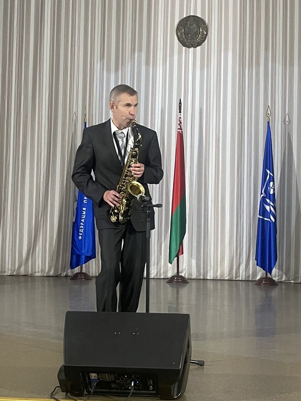 Студенты МИТСО поздравили преподавателей и сотрудников университета праздничным концертом, а профессор кафедры бизнес-анализа и математического моделирования Геннадий Викторович Столяров - игрой на саксофоне.