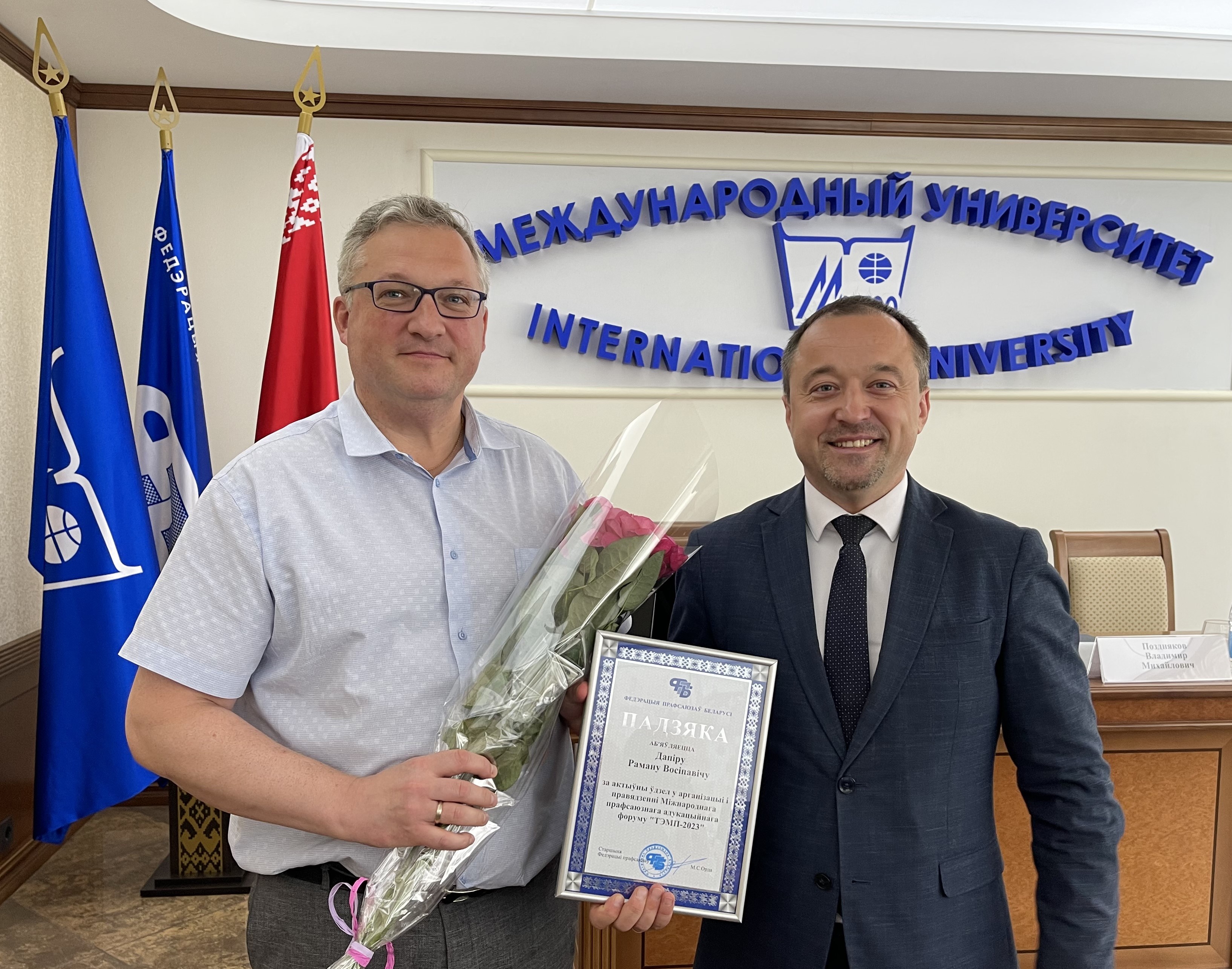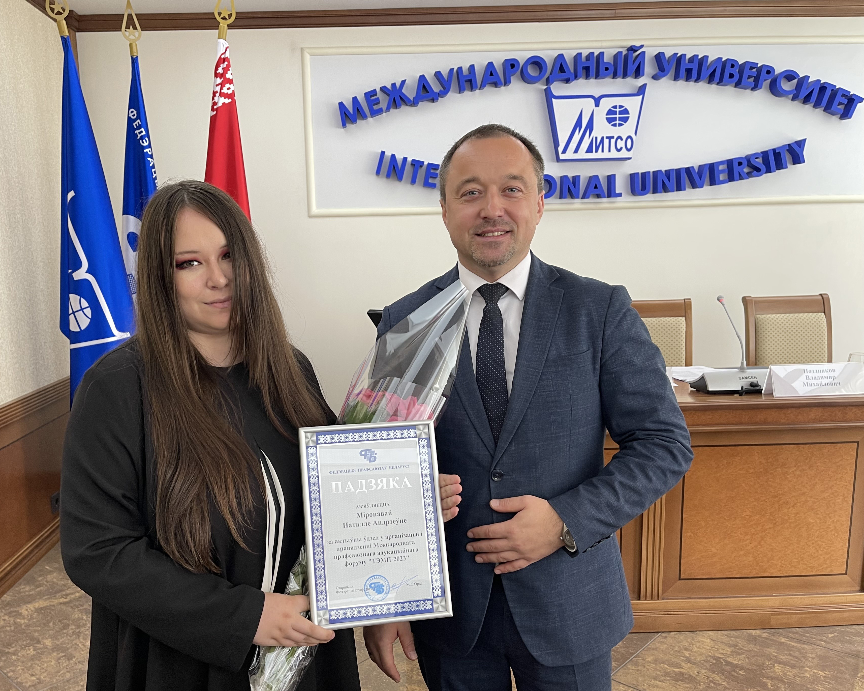 Перед началом заседания ректор университета Поздняков Владимир Михайлович поздравил всех присутствующих с началом учебного года и в торжественной обстановке вручил благодарности за активное участие в организации и проведении Международного профсоюзного образовательного форума «ТЕМП-2023» проректору Дапиро Роману Осиповичу и старшему преподавателю кафедры иностранных языков и межкультурных коммуникаций Мироновой Наталье Андреевне.
