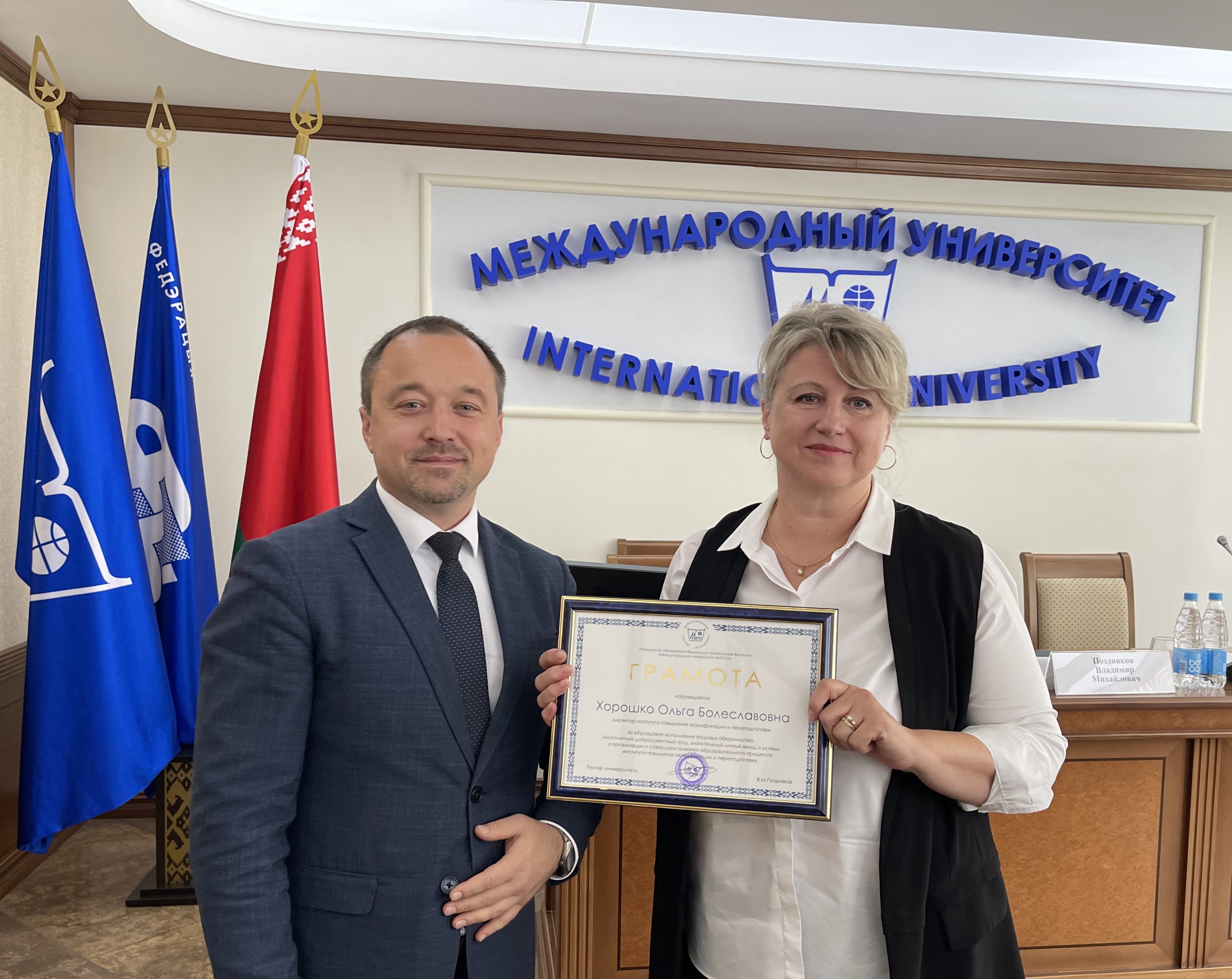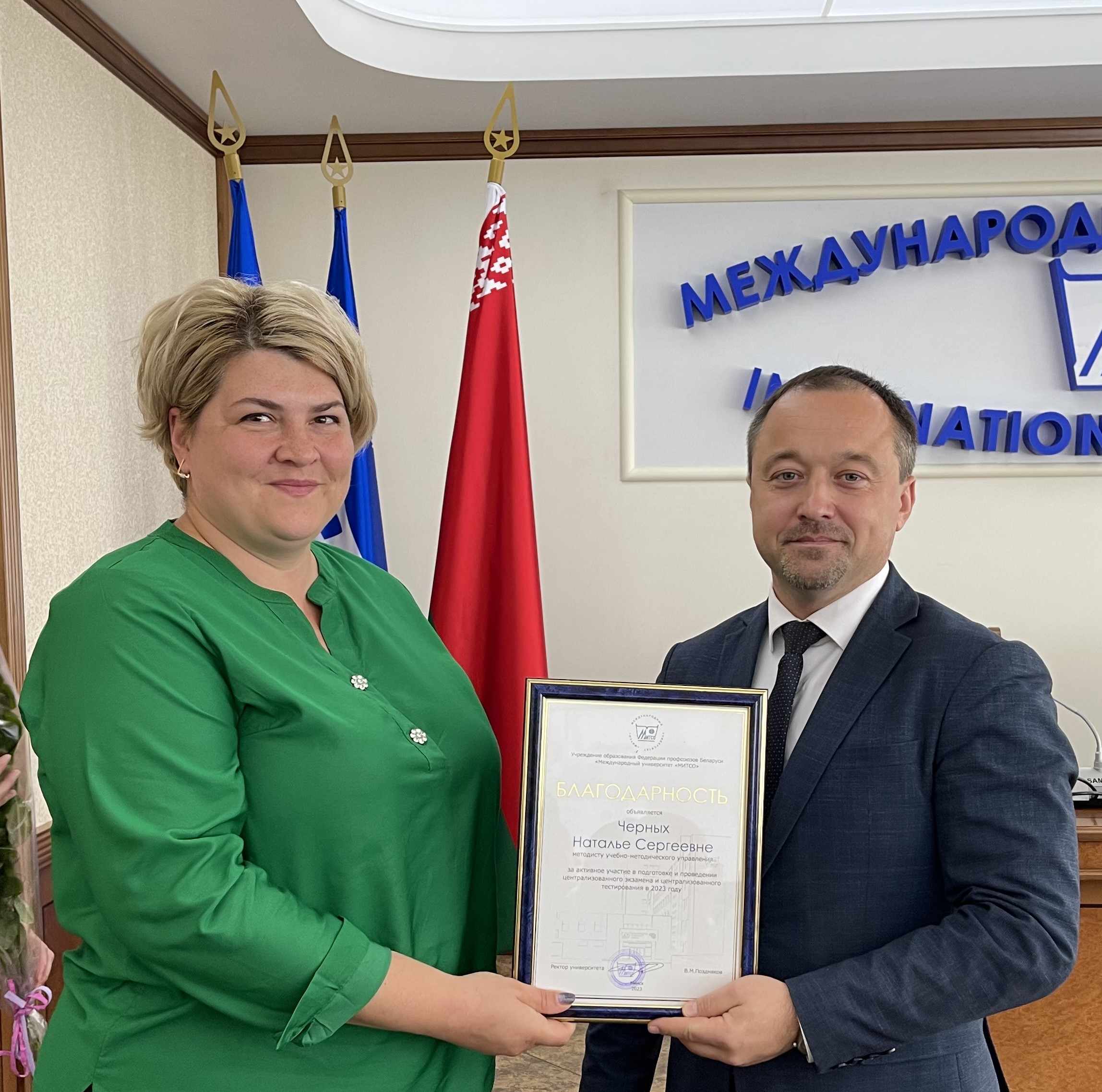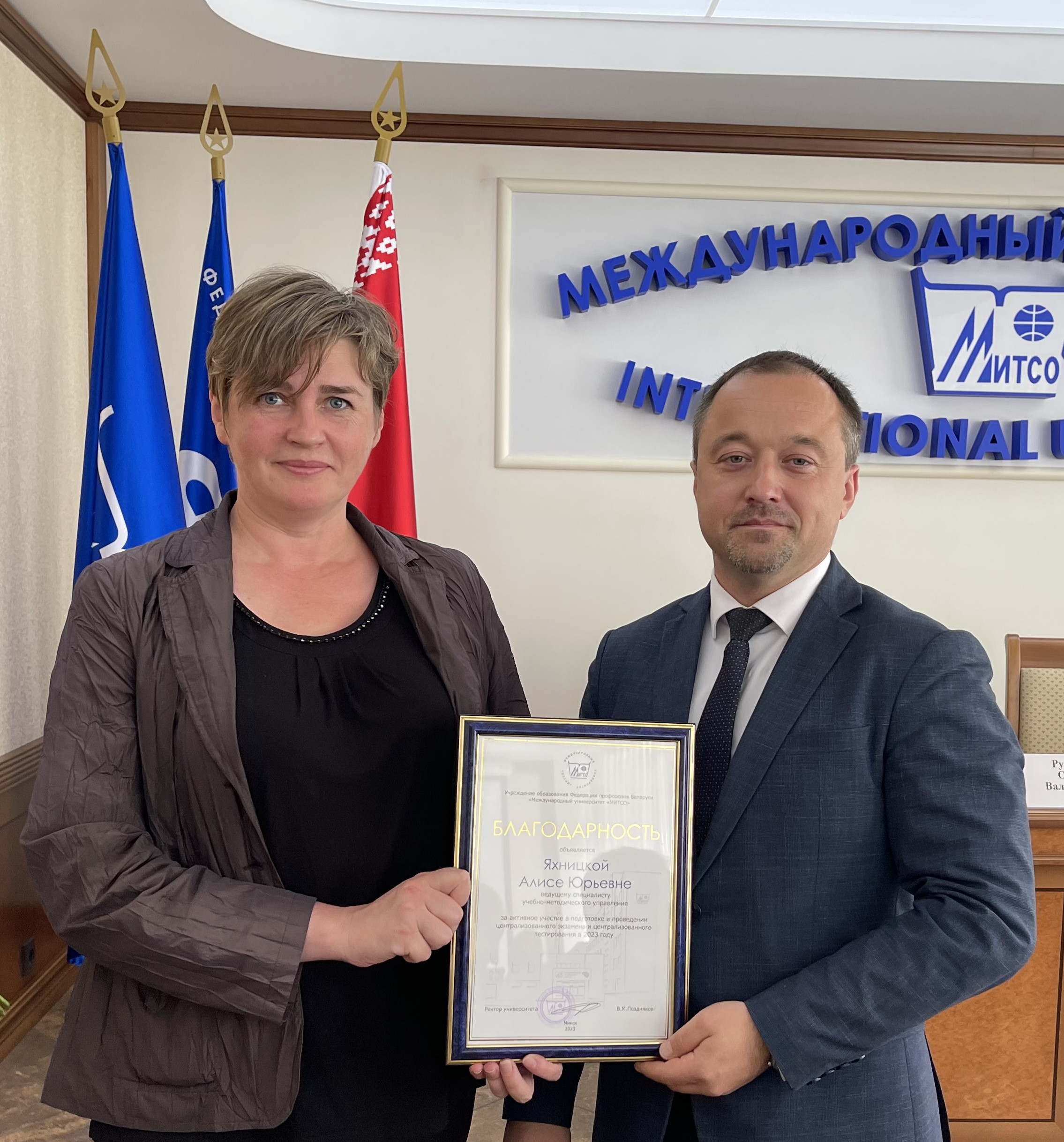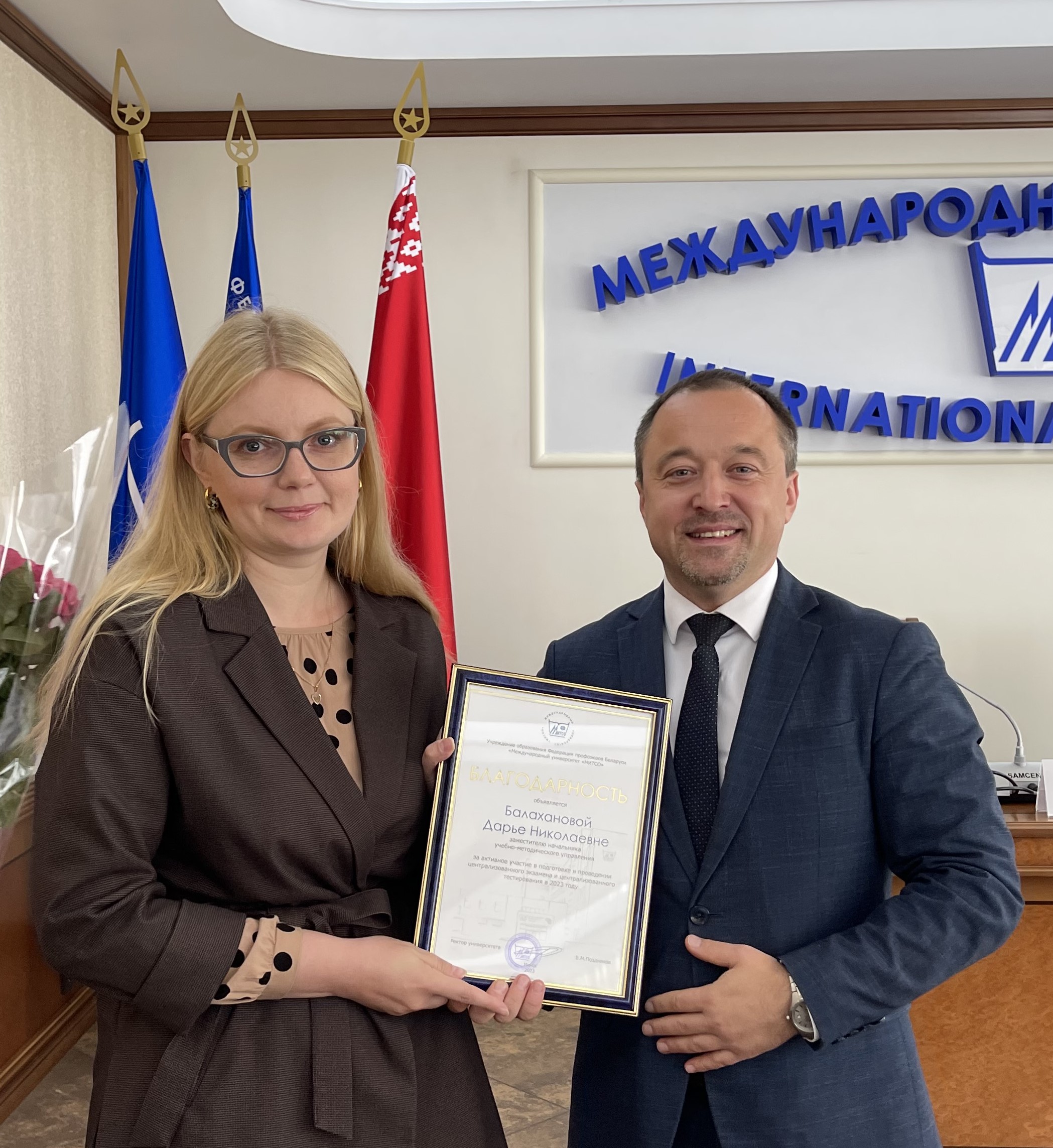 Грамоту за добросовестную работу ректор вручил директору Института повышения квалификации и переподготовки Хорошко Ольге Болеславовне, благодарности за активное участие в подготовке и проведении ЦЭ, ЦТ в 2023 году заместителю начальника учебно-методического управления Балахановой Дарье Николаевне, ведущему специалисту Яхницкой Алисе Юрьевне, методисту Черных Наталье Сергеевне.